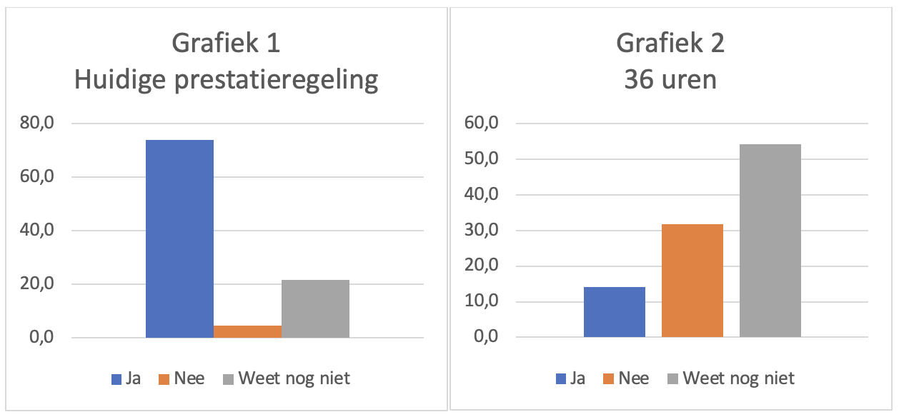 Dezelfde vraag werd gesteld, maar dan met de nieuwe prestatieregeling 36 klokuren. Dit gaf een ander beeld: 31,8% procent zegt resoluut neen en de groep die twijfelt, neemt toe tot meer dan 50 procent (grafiek 2).
