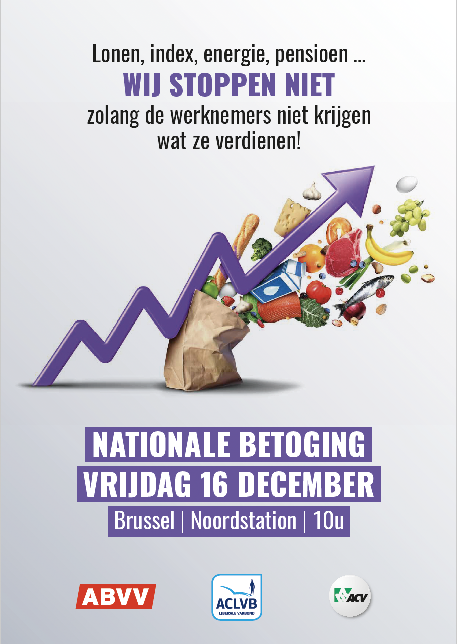 Op vrijdag 16 december komen het ABVV, het ACLVB en het ACV op straat voor loonsverhogingen, bevriezen van de energieprijzen, meer belastingen op kapitaal, behoud van de automatische loonindexering en tijdskrediet, een vrouwvriendelijke pensioenhervorming en tegen de uitbreiding van de flexi-jobs. Je vindt meer uitleg in dit pamflet.